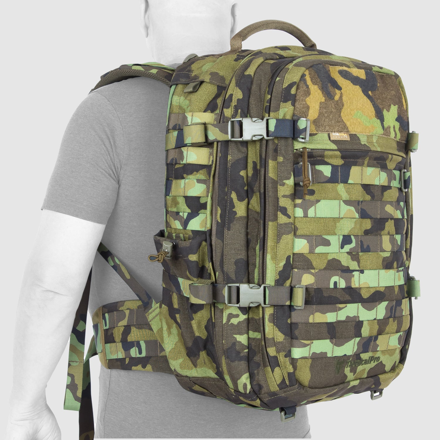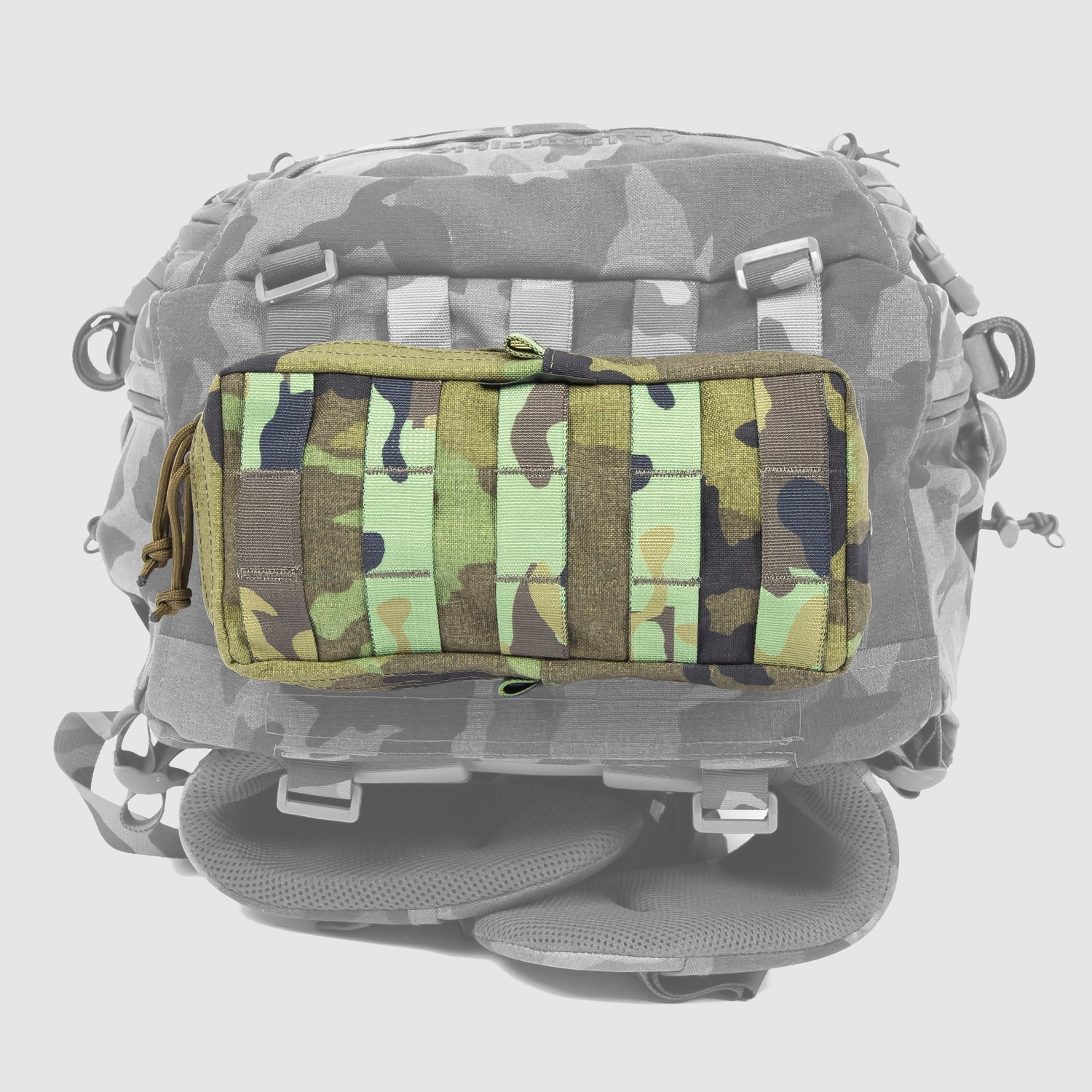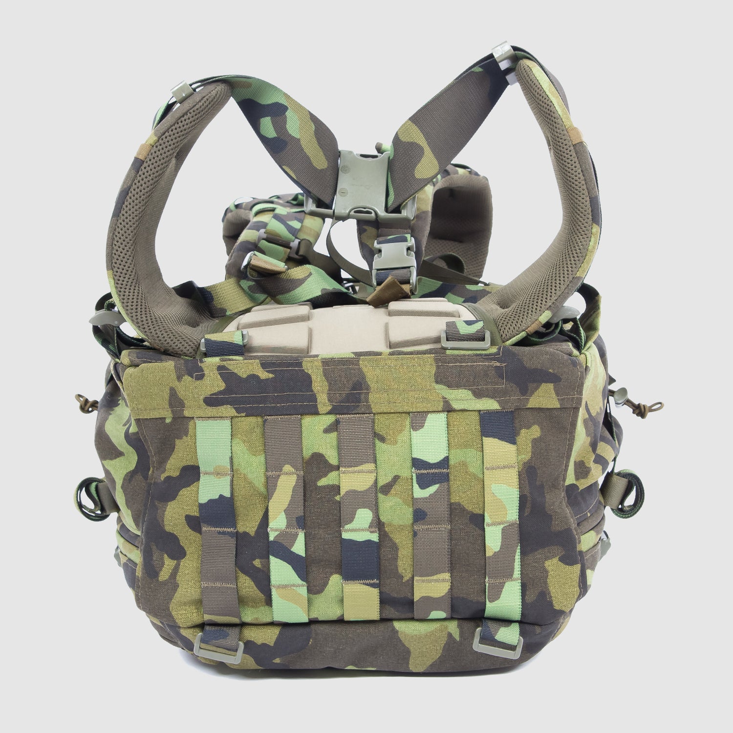 • Kompletní MOLLE vazba po celém povrchu batohu — absolutní modularita a možnost připevnit další sumky.