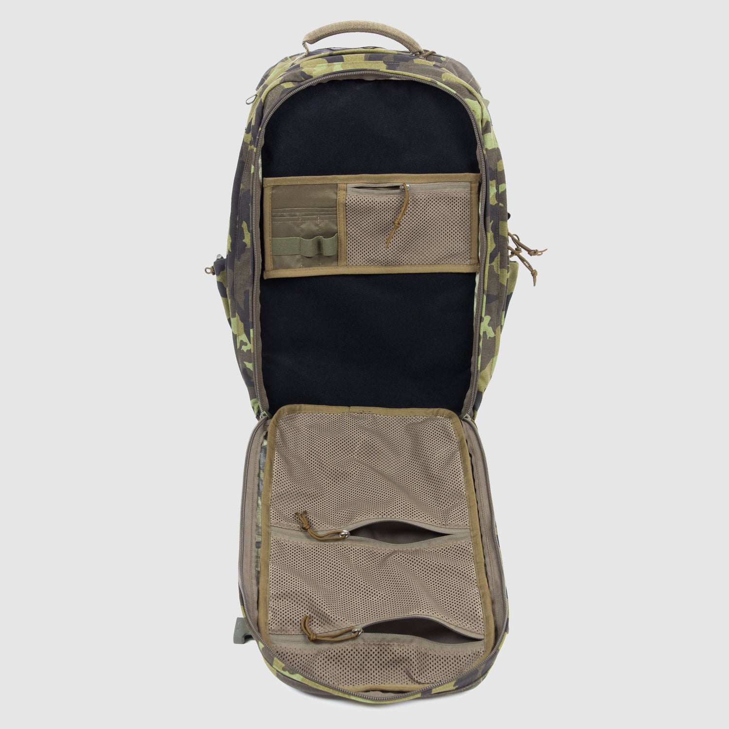 Hlavní komora se otevírá po celém obvodu zipu — umožňuje plný přehled o obsahu a snadné nakládání i vyjímání výstroje, bez nutnosti cokoliv přehrabovat.