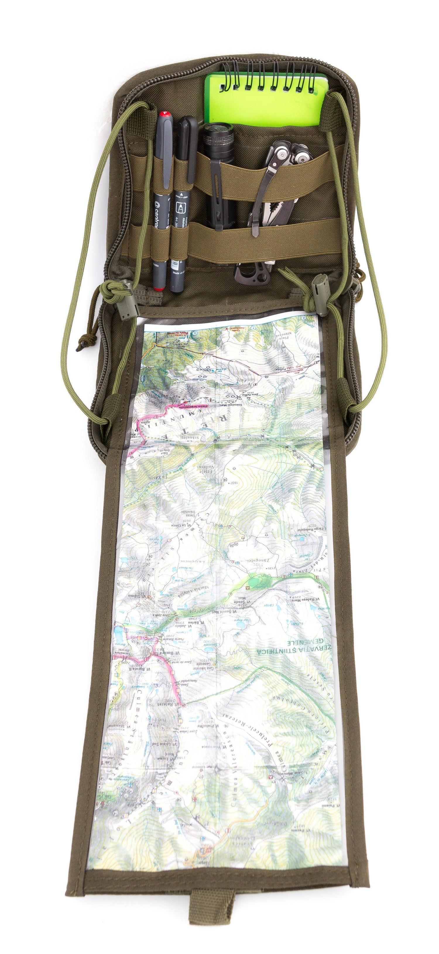 Panel se otevírá masivním spirálovým zipem. Uvnitř panelu je třikrát přeložená kapsa na mapu z průhledné fólie, jedna plochá kapsa a pruženky na psací potřeby a další drobný materiál.