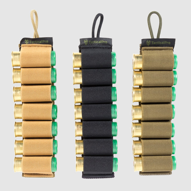 VELCRO držák brokových nábojů je panel určený pro 7 nábojů do brokovnice. Základ tvoří pevný popruh a pružná oka. Na zadní straně má panel suchý zip pro rychlé uchycení na tělo nebo pažbu brokovnice (součástí je samolepicí protikus s kvalitním lepidlem od 3M), díky čemuž můžete na tělo brokovnice připevnit nový panel s náboji, jakmile se ten stávající vyprázdní.